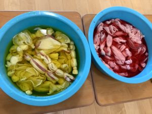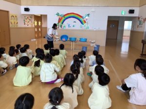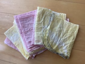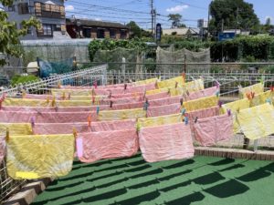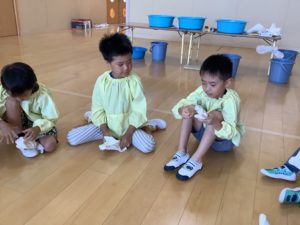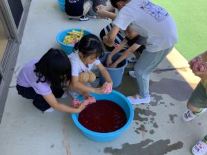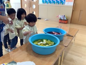 草木染め🌿 園内行事 Twitter Facebook LINE 2025.08.13 7月のある日、幼児組さんが楽しいことをしていますよ♪ 白い布に色をつけるための準備です😊ゴムでギュッと縛っています。 入れます。 漬けます。 絞ります。 干します。 出来上がり😊 今回は赤シソとクチナシの実で着色しました!楽しかったです😊